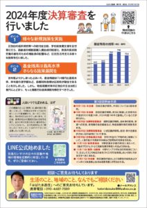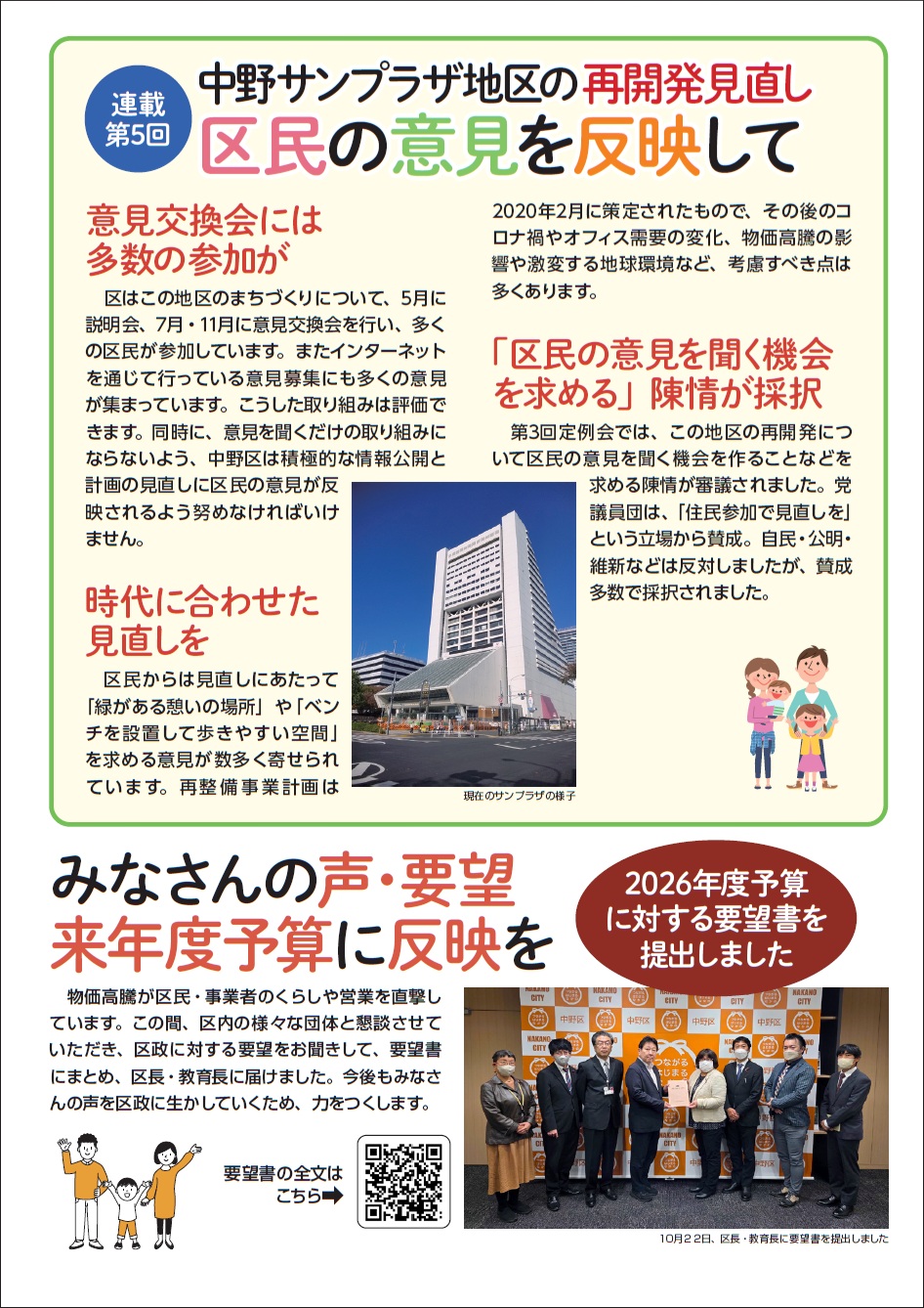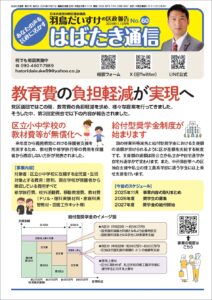 中野区が教育費の負担軽減策として発表した「教材費等無償化」「給付型奨学金」の中身についての報告や、本会議一般質問の中身をご紹介するとともに、中野サンプラザ跡再開発の続報、2024年度決算の特徴を簡潔に紹介しています。郵送をご希望される方は、お問い合わせフォームからご連絡ください。