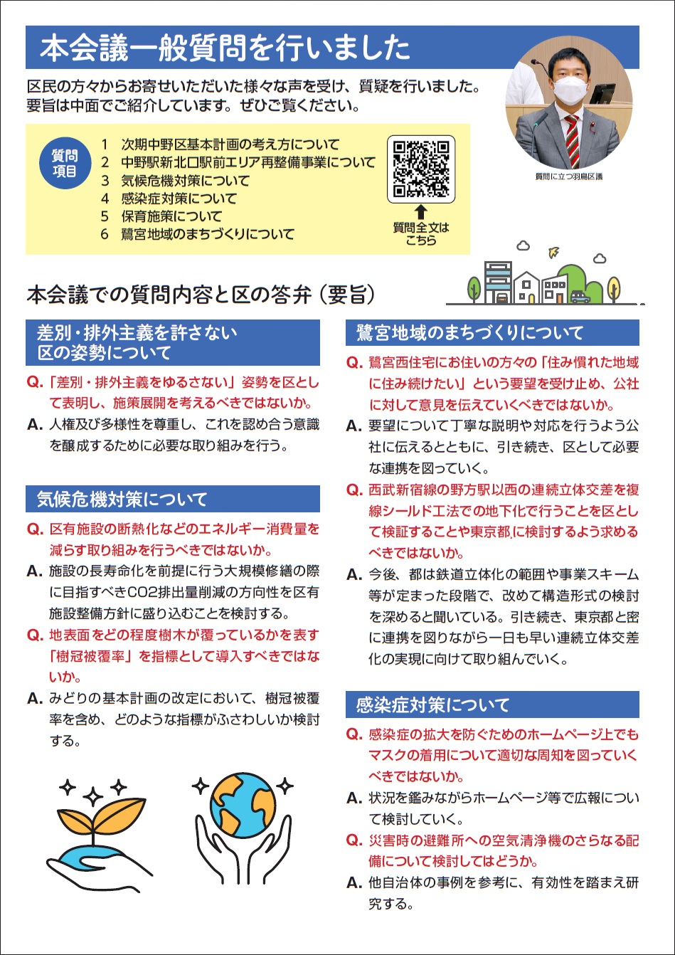 区民の方々からお寄せいただいた様々な声を受け、質疑を行いました。要旨は中面でご紹介しています。ぜひご覧ください。