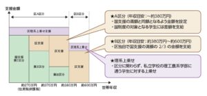 国の授業料等減免と給付型奨学金における支援額の満額が受けられるように区が差額を支給する制度です。支援額の満額は国公立か私立かや自宅通学か自宅外通学かで変わります。また、中所得世帯への区独自支援や私立の理工農系学部に通う学生には上乗せ支援を行います。